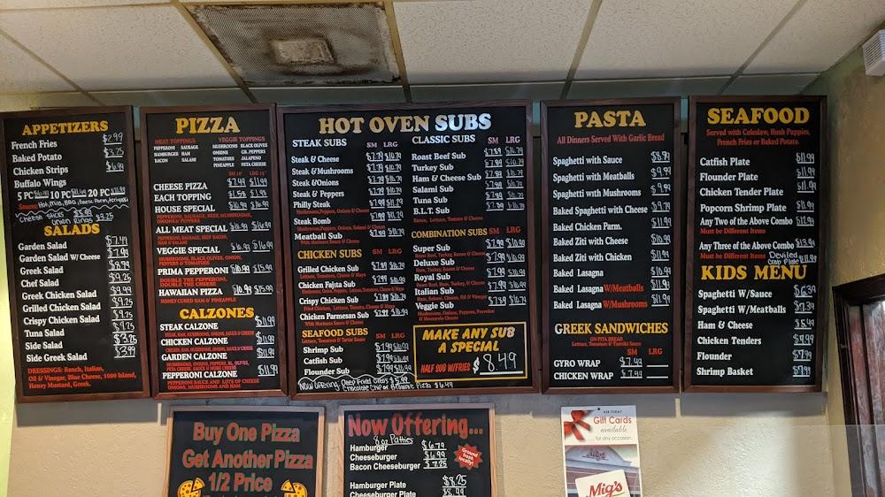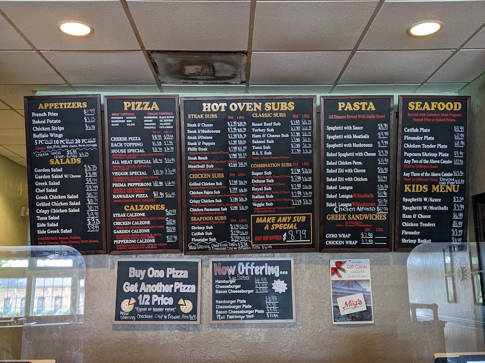 Mig's of 96 boasts a diverse menu featuring Italian favorites and American classics. Grab a pizza, like the Hawaiian or Veggie Special, and try fresh baked lasagna or a crispy chicken sub. Daily specials add variety and value.